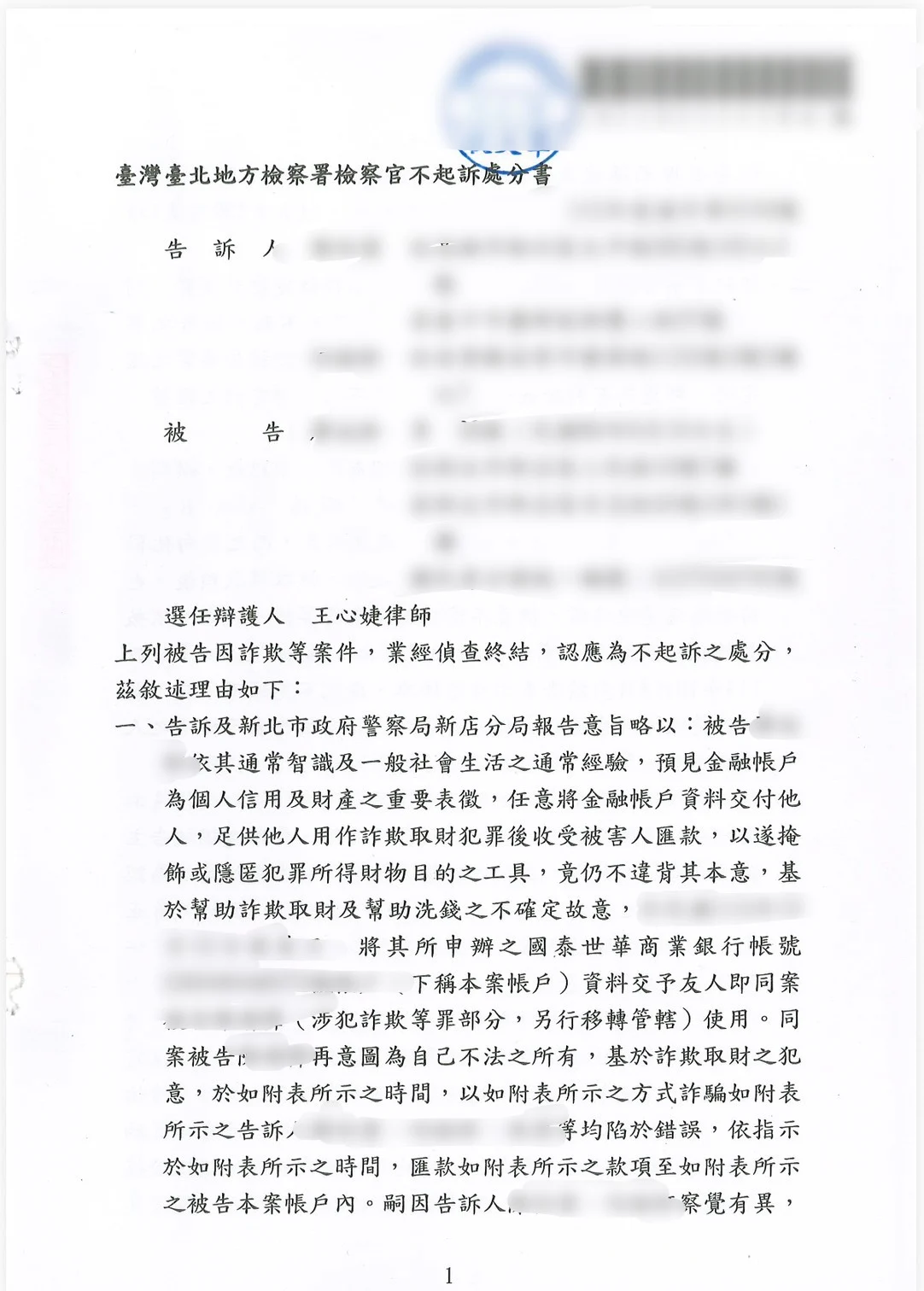 | 處理結果 | 成功爭取詐欺不起訴處分,帳戶警示解除 |