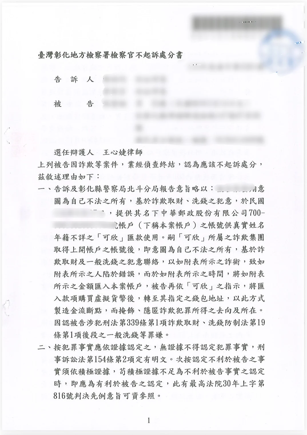 處理結果詐欺洗錢不起訴處分,成功解除警示帳戶
